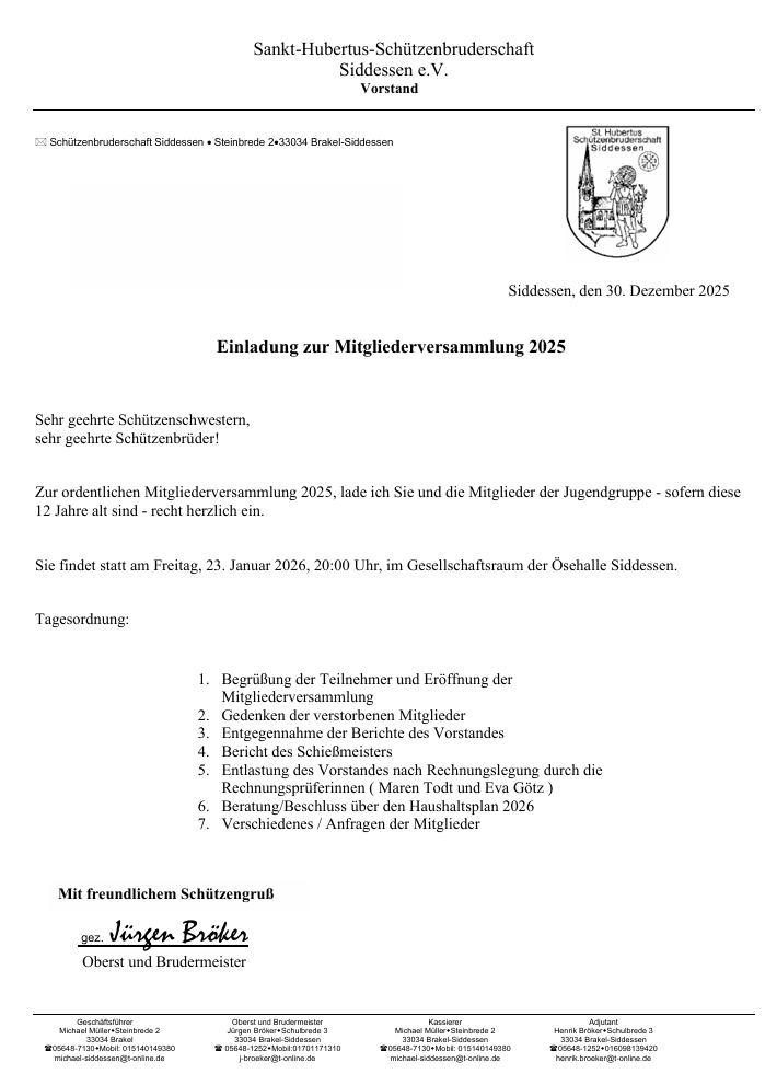 23.01.2026 Jahreshauptversammlung St. Hubertus Schützenbruderschaft Siddessen e.V 19. Januar 2026 von michaelsiddessen in Schützenverein 23.01.2026 20:00 Uhr Gesellschaftsraum der Ösehalle Siddessen