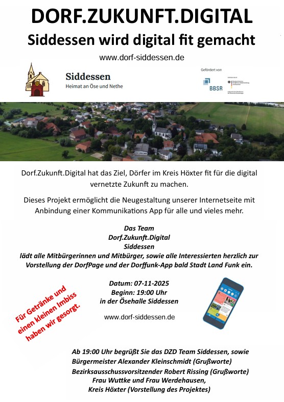 Auftaktveranstaltung DZD Dorf.Zukunft.Digital 6. November 2025 von michaelsiddessen in Allgemein, Das Dorf DZD Dorf.Zukunft.Digital Freitag 07.11.2025 19:00 Uhr Treffpunkt Alte Schule in Siddessen