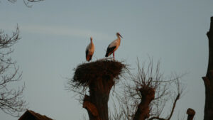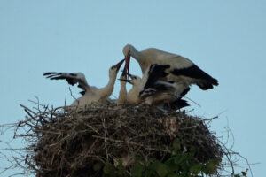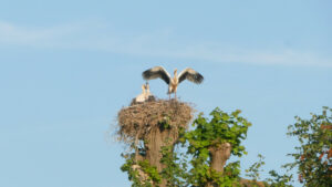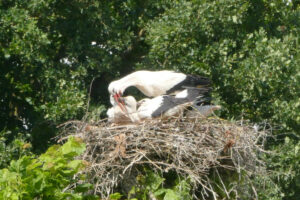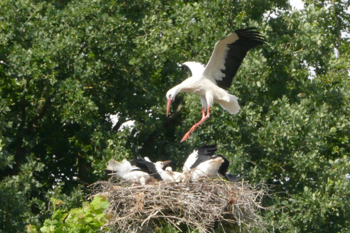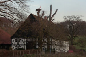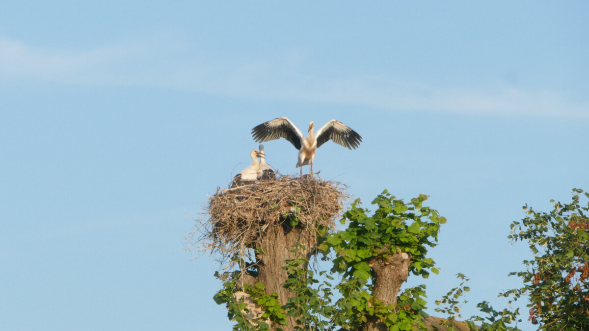 An einer Linde am Wasserhof begann das Storchenpaar letztes Jahr das erste Mal mit dem Nestbau. Die Linde wurde Ende 2024 aus Sicherheitsgründen zurückgeschnitten, was sich als großer Vorteil für die Störche herausstellte. Eifrig schleppten sie Zweige auf einen abgesägten Stumpf und errichteten dort ihren schön gelegenen Horst. Gegen Ende April konnten sie mit der Brutzeit beginnen, die etwa 32 Tage dauerte. Nach rund einem Monat schlüpften drei Küken. Anfang August wurden die Jungstörche bei ihren ersten Ausflügen auf nahegelegenen Dächern und bei der Futtersuche in den Wiesen gesichtet. Mitte August verließen die drei Jungstörche Siddessen in Richtung Süden, gefolgt von den Altstörchen, die ebenfalls ins Winterquartier zogen.