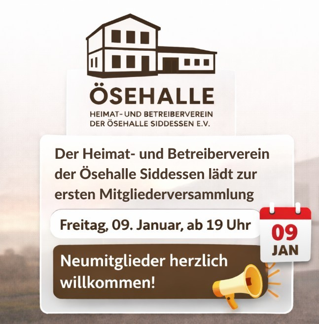 Der neu gegründete Heimat- und Betreiberverein der Ösehalle Siddessen lädt am Freitag, den 09. Januar um 19 Uhr herzlich zu seiner ersten Mitgliederversammlung im Treffpunkt Alte Schule ein. Der Vorstand freut sich darauf, neben den bestehenden Mitgliedern auch Neumitglieder begrüßen zu dürfen. Ihr seid herzlich willkommen!