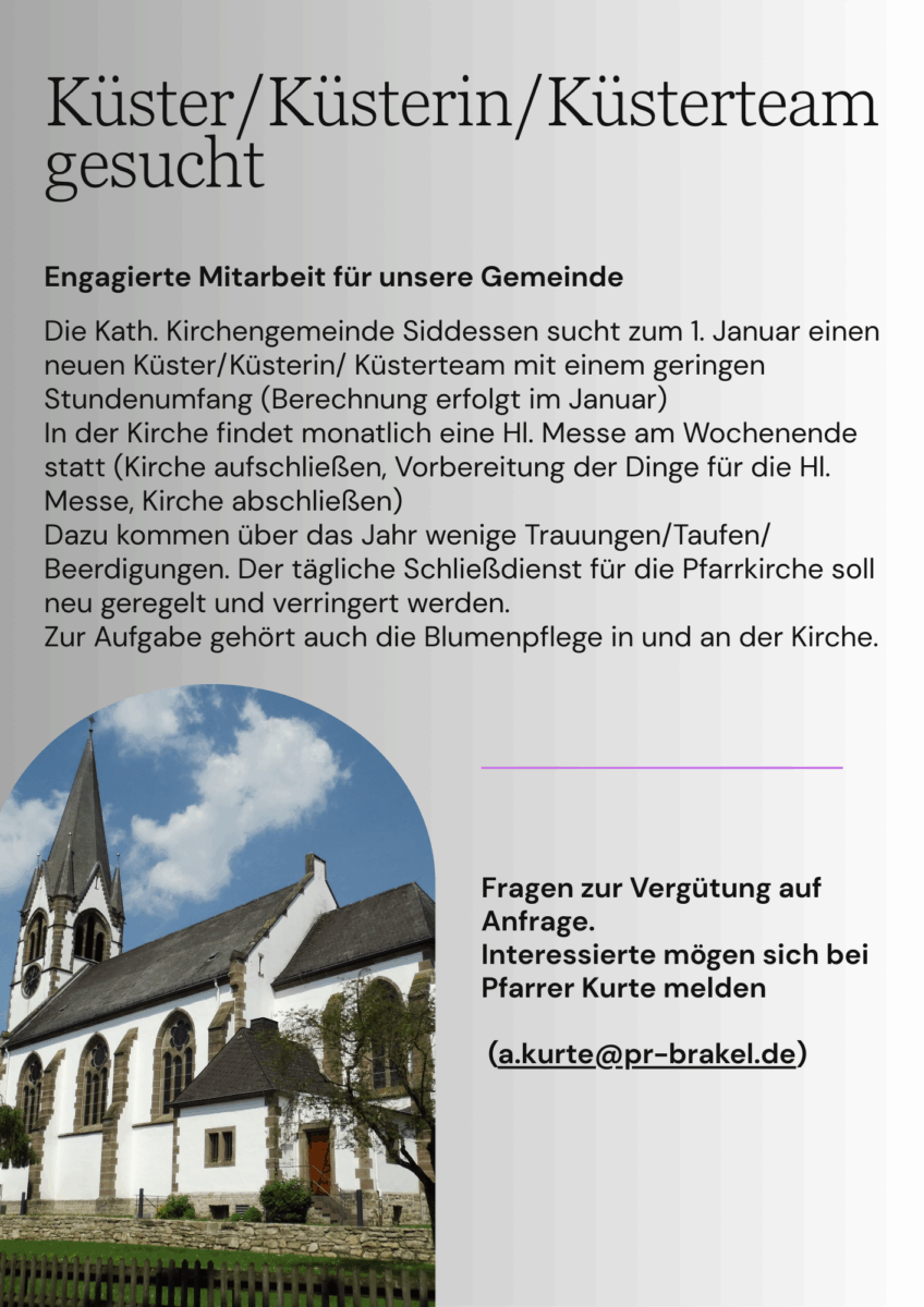 Mitarbeitende für den Küsterdienst gesucht 13. Dezember 2025 von thomasscholle in Allgemein, Das Dorf, Heimatpflege