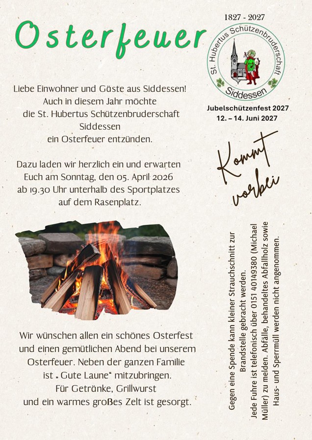 Die St. Hubertus SchĂŒtzenbruderschaft Siddessen lĂ€dt euch herzlich zum traditionellen Osterfeuer ein.